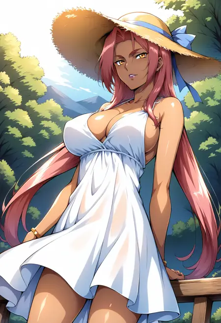 ig-sh,sundress,full body,cleavage,sun hat,white dress,sandals,straw hat,standing