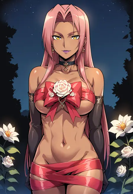 ig-sg,naked ribbon,dark-skinned female,black elbow gloves,ribbon,flower,cowboy shot,navel,standing,choker
