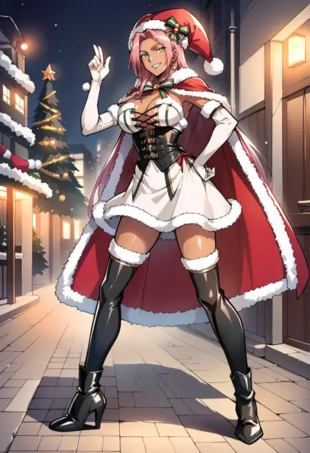 ig-ds,elbow gloves,fur trim,white gloves,santa hat,red cape,white dress,high heel boots,full body,cleavage,fur-trimmed dress,black footwear,fur-trimmed cape,black thighhighs,standing,christmas