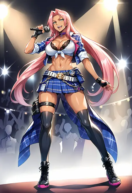 ig-dii,fingerless gloves,navel,cleavage,full body,boots,choker,midriff,plaid,bra,black thighhighs,belt,black gloves,jewelry,jacket,plaid skirt,thigh strap