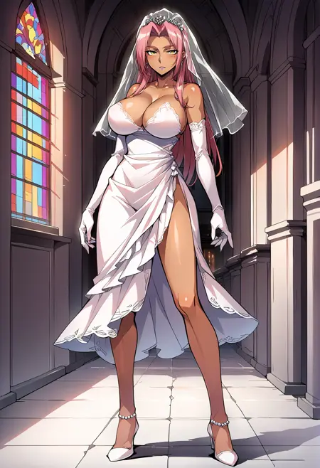 ig ed,wedding dress,elbow gloves,bridal veil,high heels,full body,white gloves,bare shoulders,side slit,bride