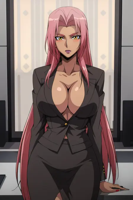 ig-sti, cleavage, business suit, no bra, pencil skirt, standing, jacket, collarbone, black skirt, center opening, open clothes