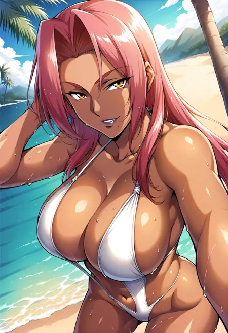 ig-bk, breasts, dark-skinned female, large breasts, jewelry, black swimsuit, bracelet, one-piece swimsuit, full body, necklace, nail polish, cleavage, armlet, long legs, legs, high heels,