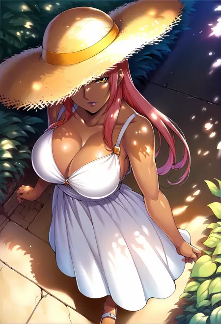 ig-sh, sundress, full body, cleavage, sun hat, white dress, sandals, straw hat, standing