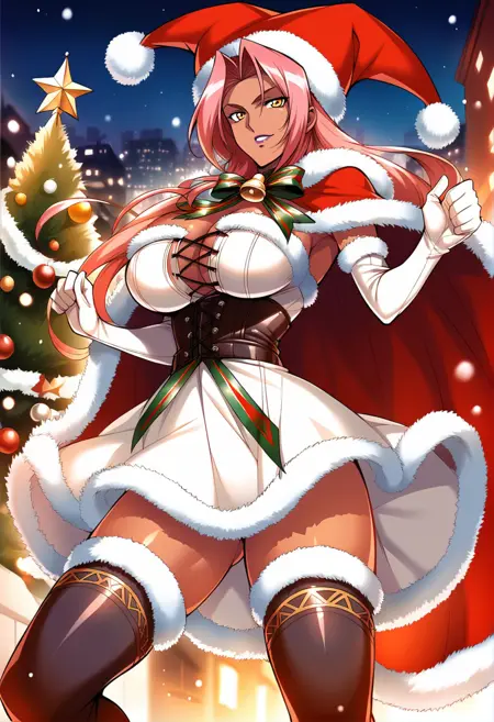 ig-ds,elbow gloves,fur trim,white gloves,santa hat,red cape,white dress,high heel boots,full body,cleavage,fur-trimmed dress,black footwear,fur-trimmed cape,black thighhighs,standing,christmas