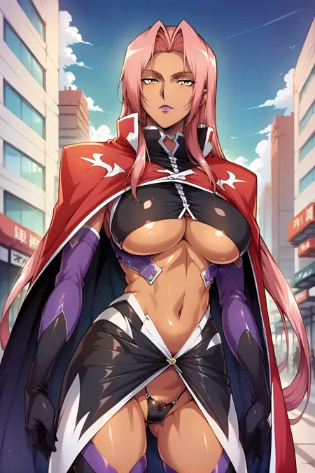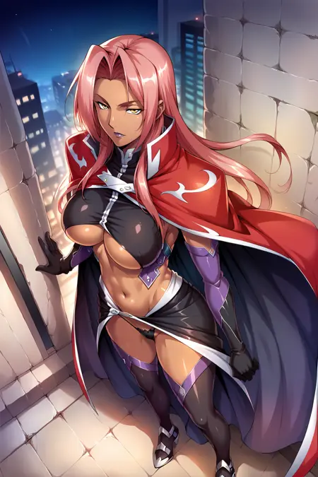 ig-hk, breasts, solo, dark skin, underboob, thighhighs, gloves, red cape, long hair, elbow gloves, navel, underwear, panties, revealing clothes