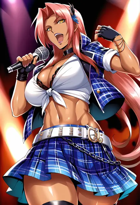 ig-dii, fingerless gloves, navel, cleavage, full body, boots, choker, midriff, plaid, bra, black thighhighs, belt, black gloves, jewelry, jacket, plaid skirt, thigh strap
