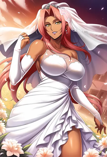 ig ed, wedding dress, elbow gloves, bridal veil, high heels, full body, white gloves, bare shoulders, side slit, bride