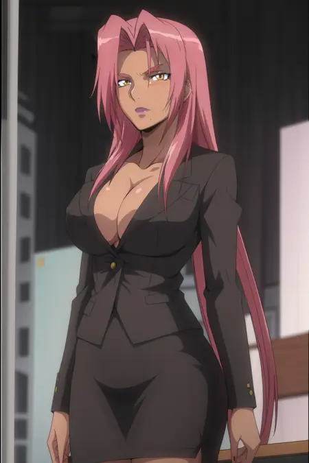 ig-sti,cleavage,business suit,no bra,pencil skirt,standing,jacket,collarbone,black skirt,center opening,open clothes
