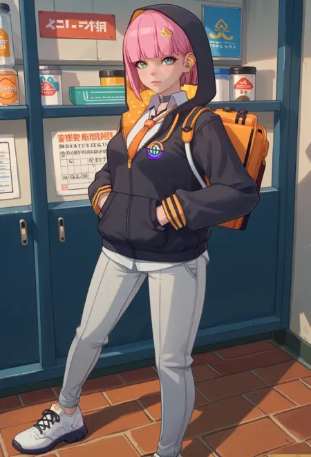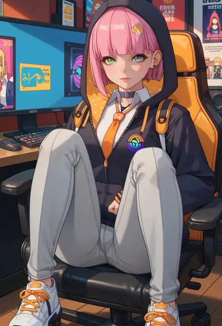 黑色项圈,黑色连帽衫,长袖,橙色领带,有领衬衫,白色衬衫,灰色裤子,鞋子,白色鞋履,拉链,拉链头,