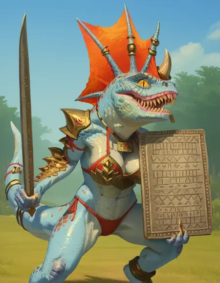 Tehenhauin, monster, anthro, holding sword, holding plaque, split tail,