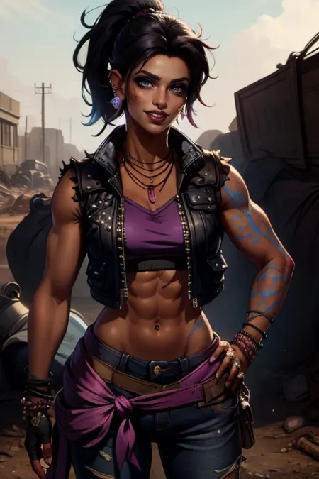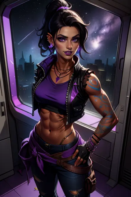 傷跡がある可能性あり。引き締まった、または筋肉質な体、パープルの唇を追加できます。
