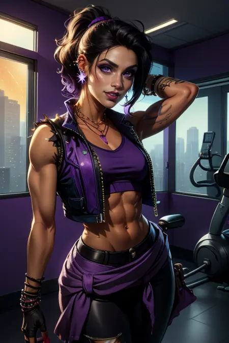 右手の指なし手袋、耳 piercing、イヤリング、腹部露出、カーポップ、またはパープルのカーポップ、裂けた服、スパイク付きの黒いベスト、ブレスレット、ズボン、ブーツ、ネックレス、ベルト、右前腕の包帯、ジッパー、