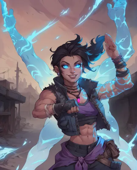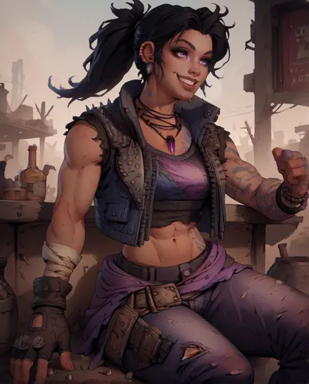 오른쪽 손가락 없는 장갑, 귀 피어싱, 귀걸이, 배꼽 노출, 크롭탑 또는 보라색 크롭탑, 찢어진 옷, 송곳니가 달린 검은 조끼, 팔찌, 바지, 부츠, 목걸이, 벨트, 오른쪽 팔뚝 붕대, 지퍼,