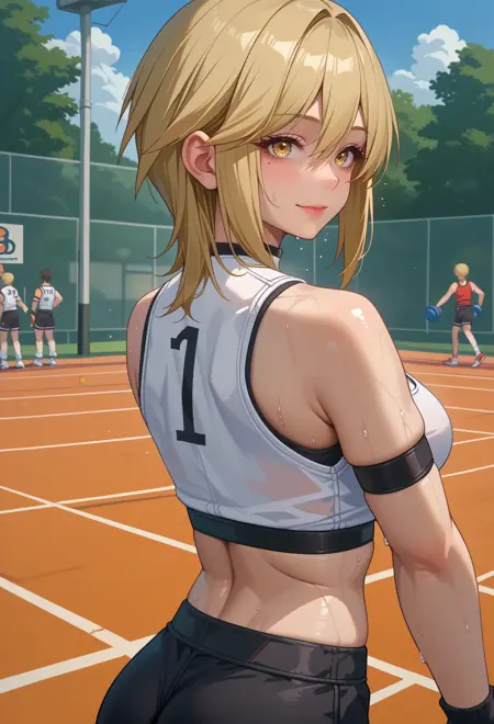 노란 눈, 금발 머리, 중간 길이 머리, 측면 머리카락, 눈 밑 점,