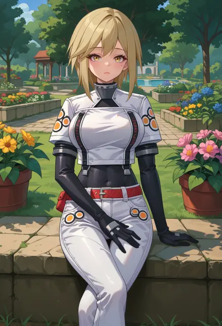 검은 바디수트, 배꼽 가려짐, 짧은 재킷, 흰색 재킷, 짧은 소매, 검은 장갑, 팔꿈치 장갑, 벨트 주머니, 빨간 벨트, 흰색 바지, 검은 신발,