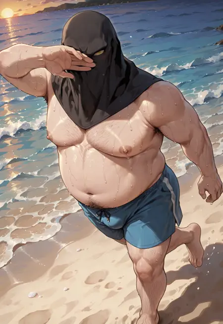 thelonious, solo, fat man, 1boy, black hood, black hat, yellow eyes, grey vest, grey shorts, white shirt, white pants, boots, belt, belt buckle,