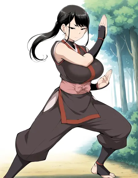 Kunasan, (1girl, 長髪, 黒髪, 黒目, ポニーテール, 大きな胸, 成熟した女性, 忍者, 日本衣装)。