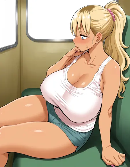 Arao, (1girl, 長髪, ポニーテール, 金髪, 青目, 超巨大な胸, ギャル, 黒肌, 成熟した女性, タンクトップ, 短パン)。