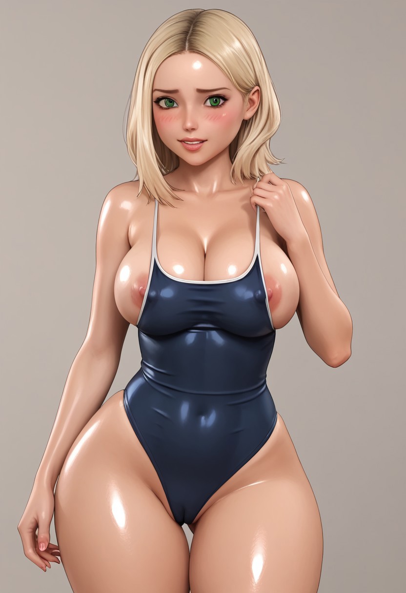 MaddisonDDL, 1girl, blonde hair, long hair, forehead, big eyes, green eyes, curvy, big breasts,