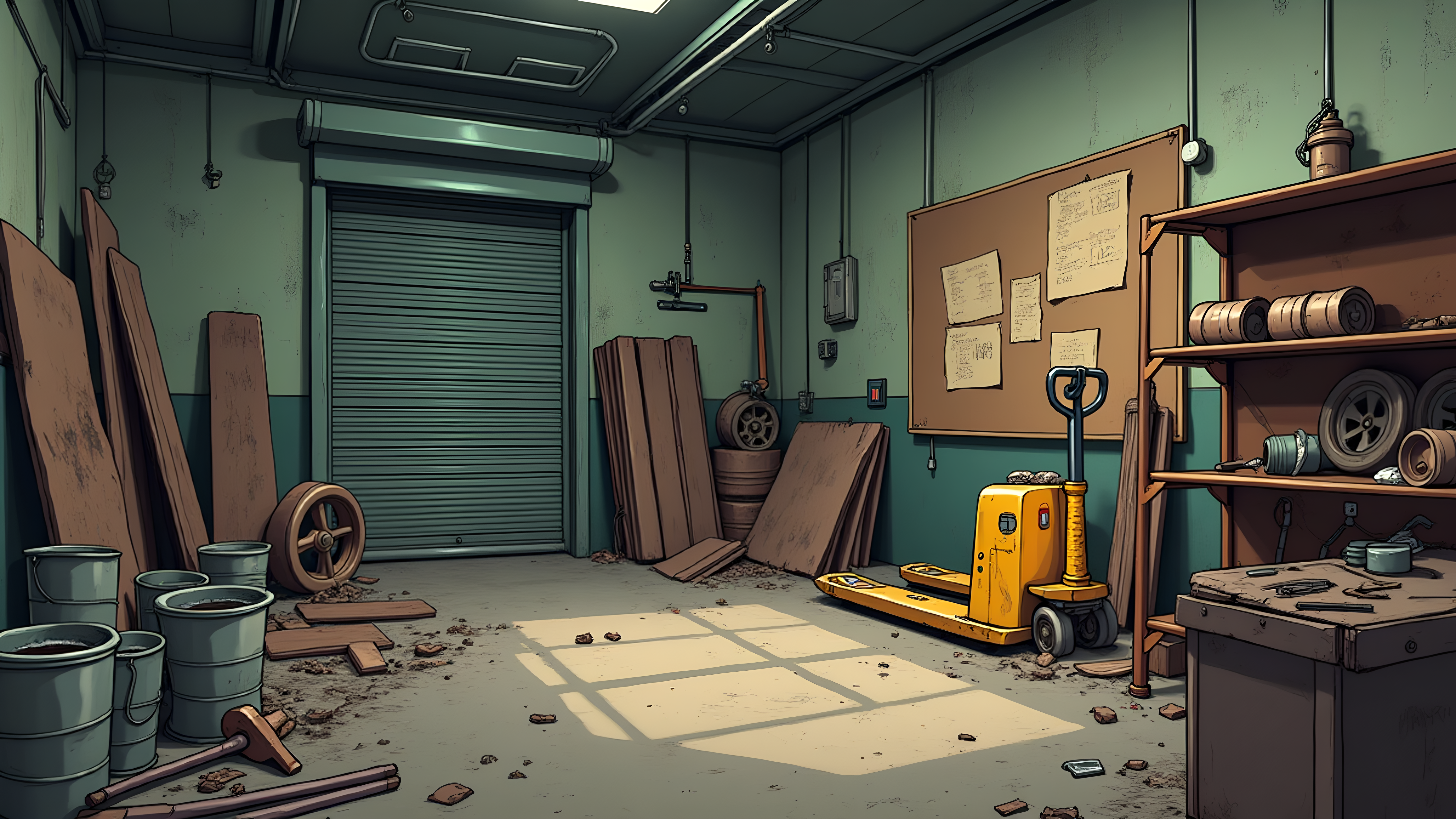 cpollabandbuilding, cpollabbdsthl, storage hall, warehouse, indoor ,abandoned building, liminal, liminal space, olive green, filthy, damaged, crap, waste, wasted, blood, broken stuff, horror, depressing, death and decay, roll-up door, rusted steel shelving units