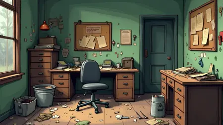 cpollabandbuilding, cpollabbdachr, archive room, paper room, indoor ,abandoned building, liminal, liminal space, olive green, filthy, damaged, crap, waste, wasted, blood, broken stuff, horror, depressing, death and decay, worn wooden table, rusted typewriter, flickering desk lamp, overfilled ashtray, filing cabinets