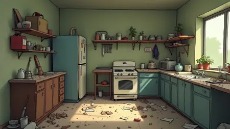 cpollabandbuilding, cpollabbdktch, kitchen, break room, indoor ,abandoned building, liminal, liminal space, olive green, filthy, damaged, crap, waste, wasted, blood, broken stuff, horror, depressing, death and decay