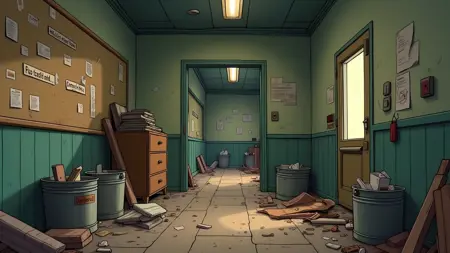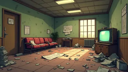 cpollabandbuilding, cpollabbdsprr, anteroom, small lobby, outer office, indoor ,abandoned building, liminal, liminal space, olive green, filthy, damaged, crap, waste, wasted, blood, broken stuff, horror, depressing, death and decay