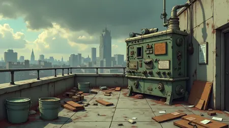cpollabandbuilding, cpollabbdextrof, on the roof, outdoor ,abandoned building, liminal, liminal space, olive green, filthy, damaged, crap, waste, wasted, blood, broken stuff, horror, depressing, death and decay, cityscape, dark clouds, dark sky
