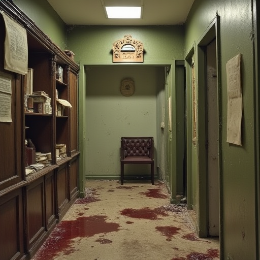 cpollabandbuilding, cpollabbdor, office room, bureau, indoor ,abandoned building, liminal, liminal space, olive green, filthy, damaged, crap, waste, wasted, blood, broken stuff, horror, depressing, death and decay