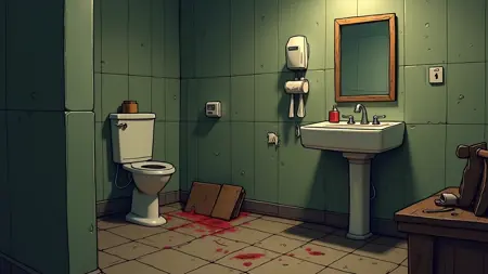 cpollabandbuilding, cpollabbdpwccb, toilet cabin, cabins in public bathroom, indoor ,abandoned building, liminal, liminal space, olive green, filthy, damaged, crap, waste, wasted, blood, broken stuff, horror, depressing, death and decay, cabin, sink, mirror, urinal
