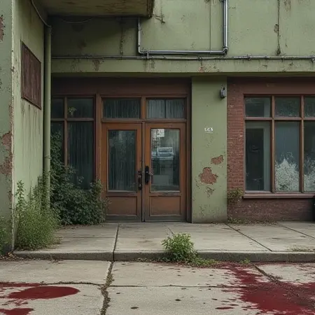 cpollabandbuilding, cpollabbdextent, exterior of corporate building, entrance door, outdoor ,abandoned building, liminal, liminal space, olive green, filthy, damaged, crap, waste, wasted, blood, broken stuff, horror, depressing, death and decay