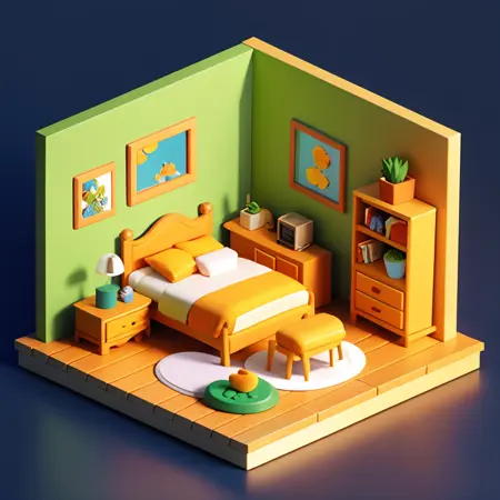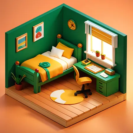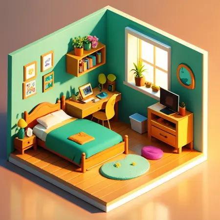 1 room, lighting, isometric view, micro room, clay material, isometric room, cute cartoon room, couch, flower, flower_pot, leaf, no_humans, plant, bed, desk,computer, lora:room:0.6window, bed, chair, table, plant, scenery, plate, door, bookshelf, potted_plant, lamp, bedroom, carpet, rug, cabinet