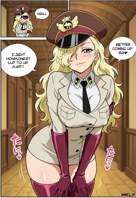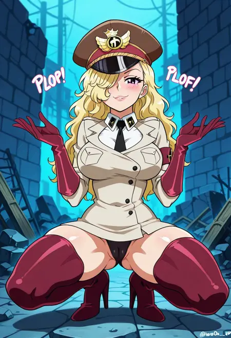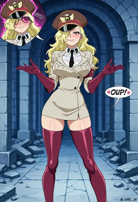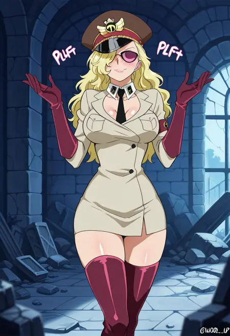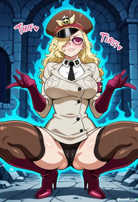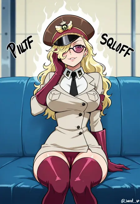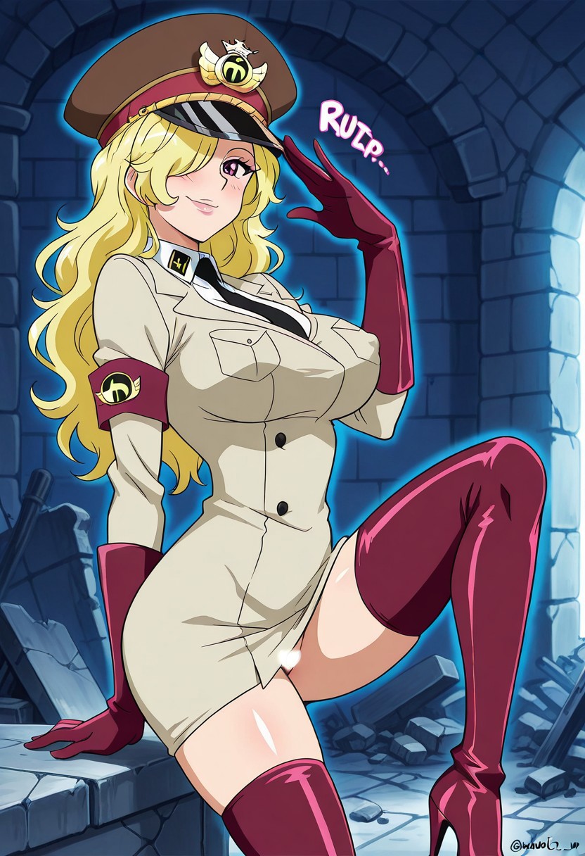 DominoOP, 1소녀, 싱글, 긴 머리, 파동 모양 머리, 금발, 선글라스, 한쪽 눈에 덮인 머리카락, 입술, 큰 가슴, 유니폼, 모자, 넥타이, 뾰족한 모자, 군복, 장갑, 하이힐, 부츠, 허벅지까지 오는 양말, 셔츠, 무릎 위 부츠, 허벅지 부츠, 재킷, 치마, 주머니, 팔찌, 칼라,