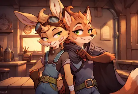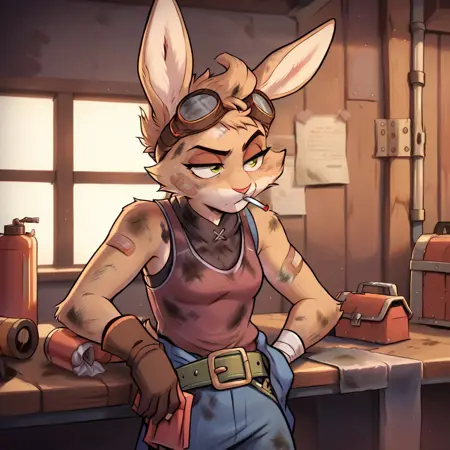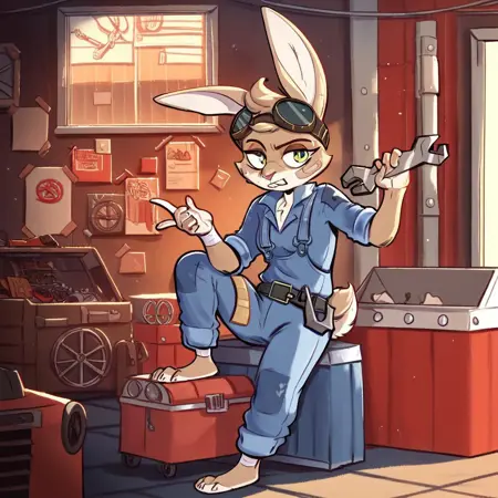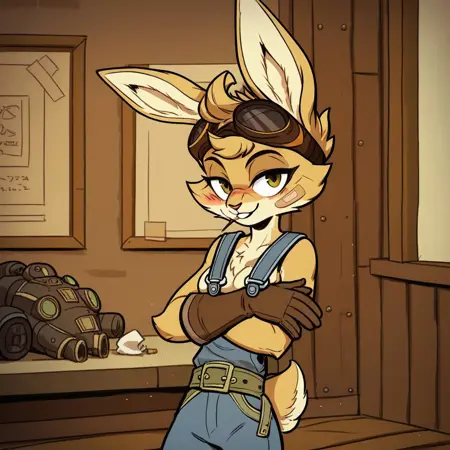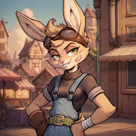 Rivals Outfit: goggles on head, band-aid, black overalls, blue jumpsuit, barefoot, rabbit tail