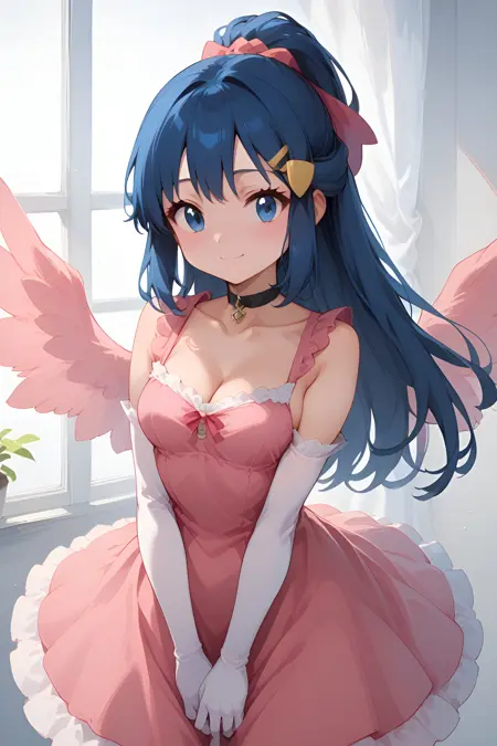 - 手套, 连衣裙, 肘部手套, 白色手套, 深V领, 粉色连衣裙, 马尾, 发饰, 发夹, 项圈, 锁骨, 中等胸型, 翅膀, 荷叶边, 荷叶边连衣裙, 黑色项圈, 刘海, 侧发, 长发, 无袖, 无袖连衣裙, 替换服装