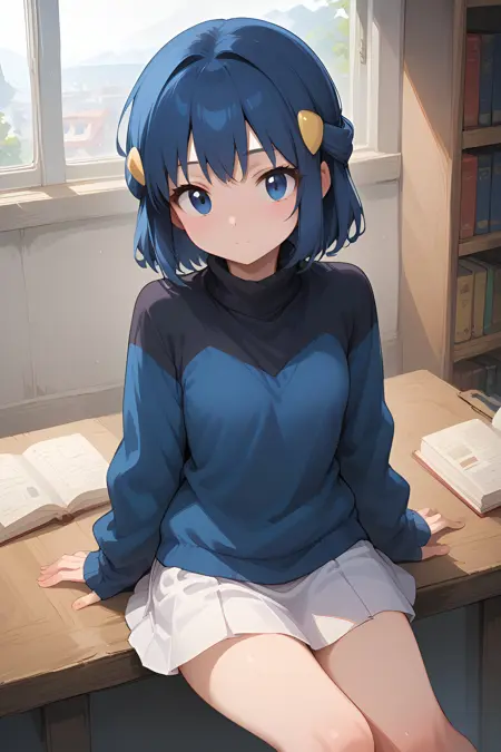 - 裙子, 毛衣, 蓝色毛衣, 长袖, 白色裙子, 蓝色毛衣, 百褶裙, 发饰, 刘海, 超短裙, 高领, 短发, 大腿, 高领毛衣
