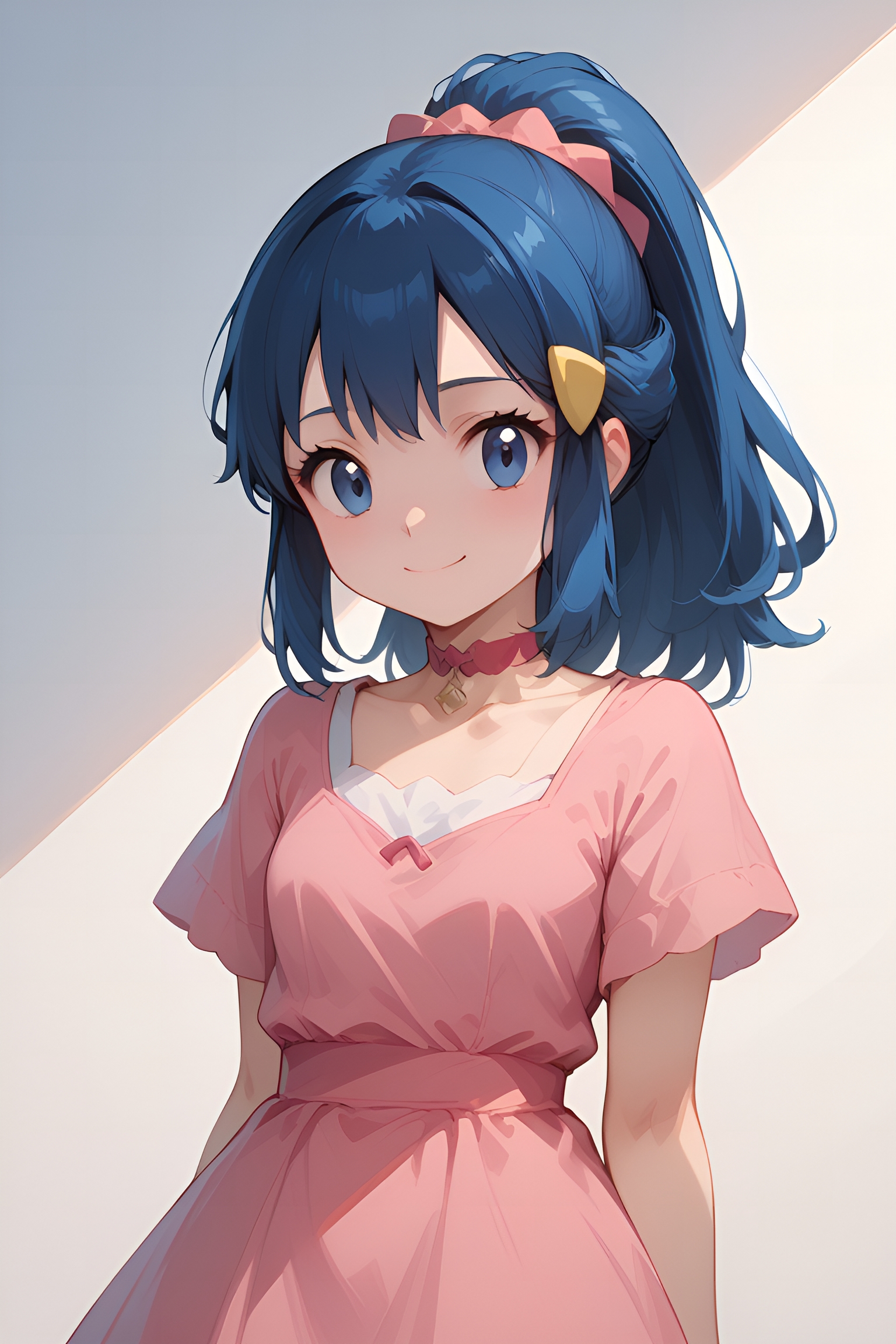- 连衣裙, solo, 粉色连衣裙, 马尾, 发饰, 项圈, 发夹, 短袖