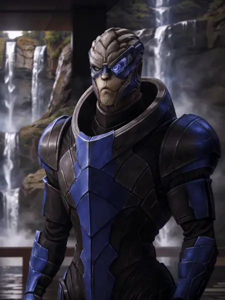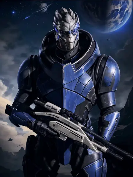 例のプロンプト:masseffectgarrus standing in a room / masseffectgarrus holding a sniper in a planet / close up of masseffectgarrus in a atrium with plants。