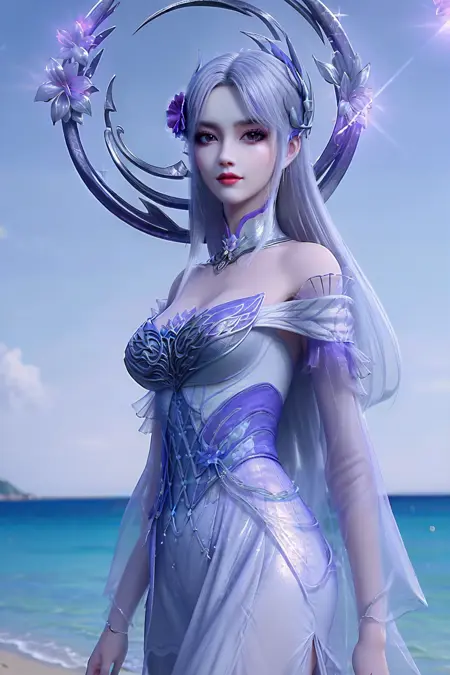**【提示词】**xiaoyixian,1girl,solo,purple dress,silver circle,glowing flower,breasts,hair ornament,closed mouth,looking at viewer,pale skin,side slit,