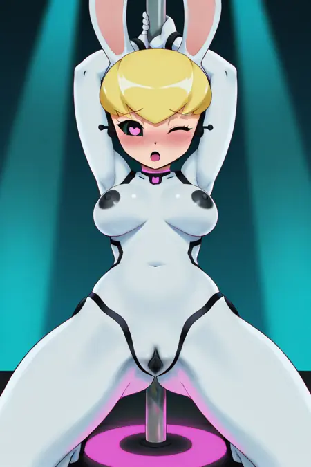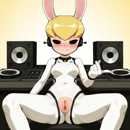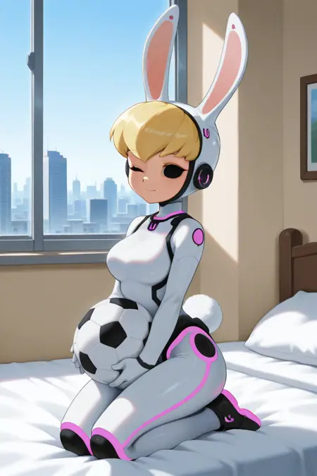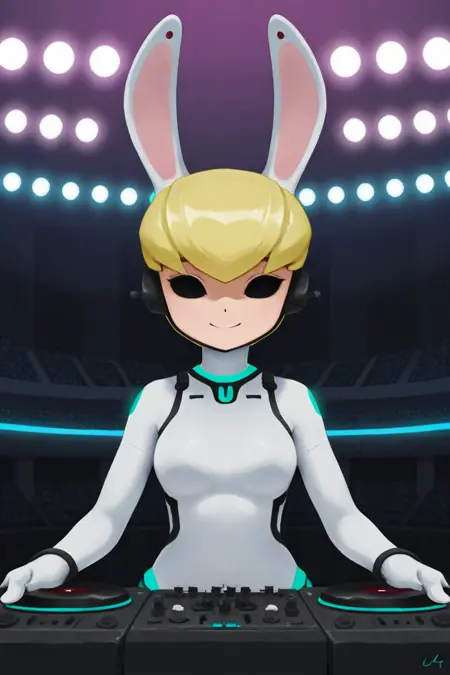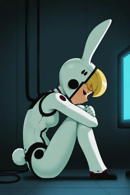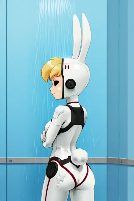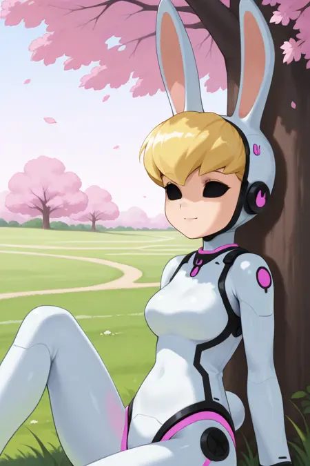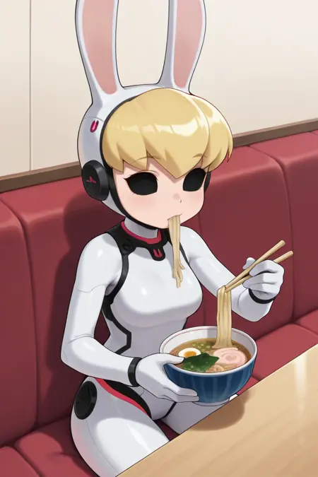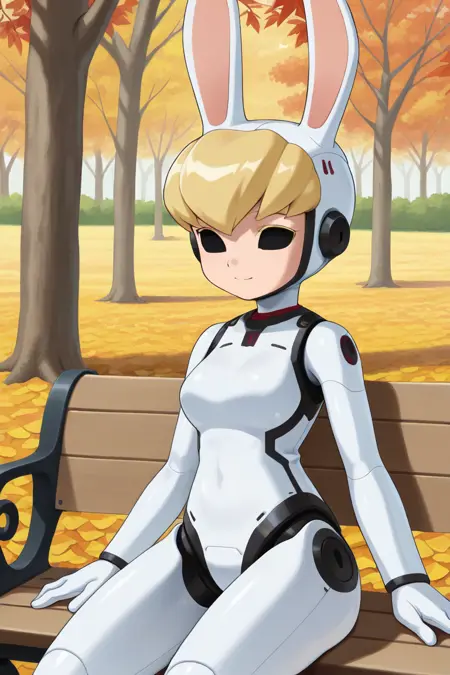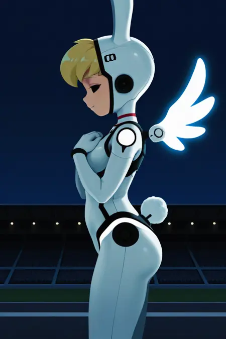 외모 태그 [Illustrious V2.1]: 로봇, 흰색 몸체, 흰색 바디슈트, 밝은 피부 얼굴, 짧은 머리, 금발, 헬멧, 토끼 귀, (검은 공막, 동공 없음), 토끼 꼬리
