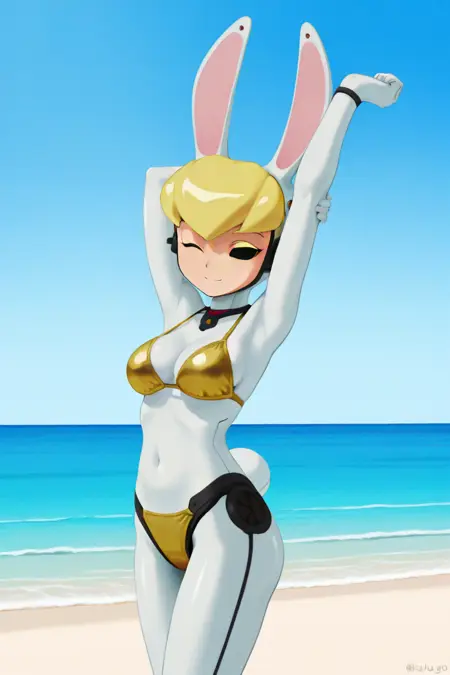 외모 태그 [Illustrious V1]: 흰색 몸체, 로봇 관절, 헬멧, 짧은 머리, 금발, 검은 눈, 토끼 귀, 토끼 꼬리, 로봇