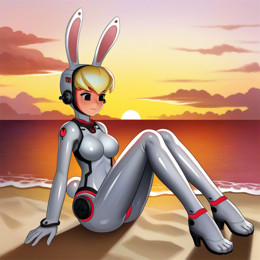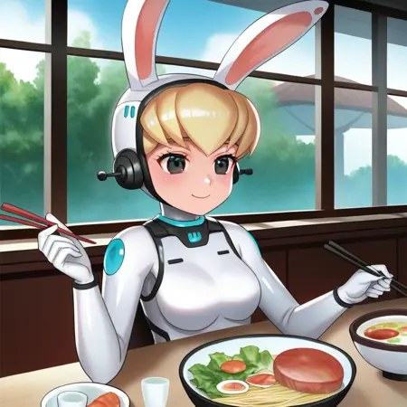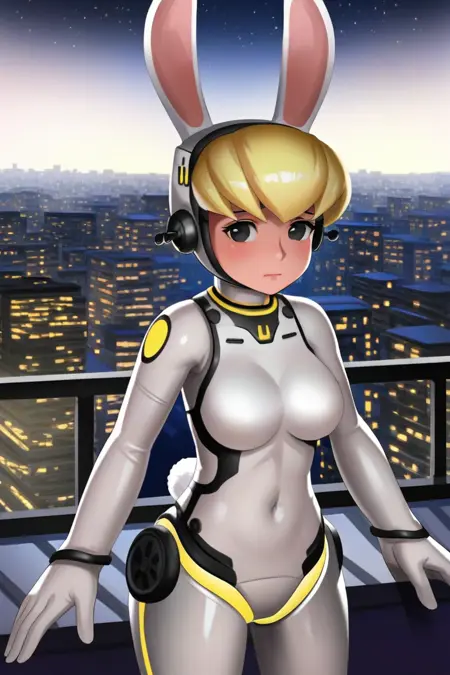 Appearance tags [Illustrious V2.1]: robot, white body, white bodysuit, light skin face, short hair, blonde hair, helmet, rabbit ears, (black sclera, no pupils), rabbit tail