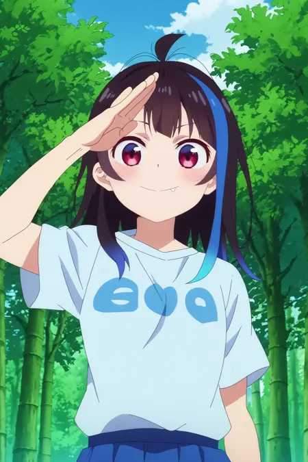 🎋 - 触发词:mini yaemori,1girl,solo,蓝色头发,多色头发,衬衫,发色渐变,虎牙,刘海,白衬衫,长发,脸颊泛红,微笑,看向观众,裙子