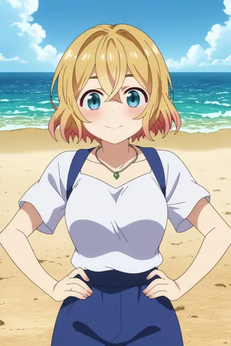 🏖️ - トリガー: mami nanami,1girl,solo,short hair,smile,blush,looking at viewer,hair between eyes,multicolored hair,hirt,necklace,blush,white shirt,gradient hair,breasts