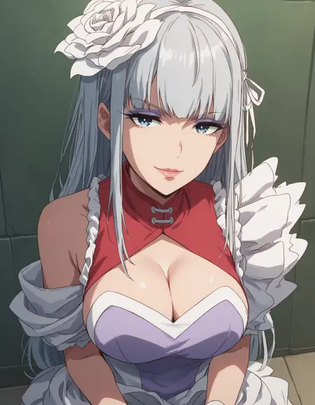 white hair ornament, white clothing, asymmetrical clothes, white skirt, asymmetrical legwear, white thighhigh