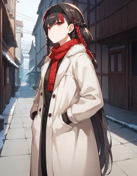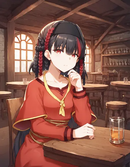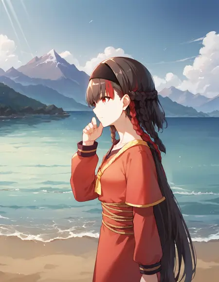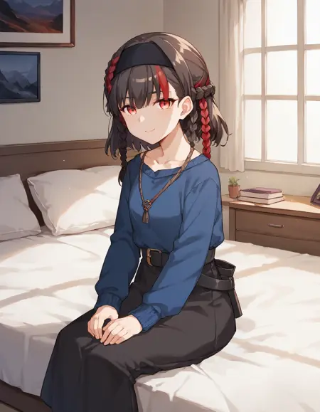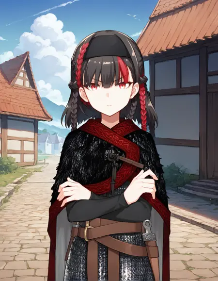 外貌: 黑红相间的头发,多条辫子,红色眼睛,黑色发带