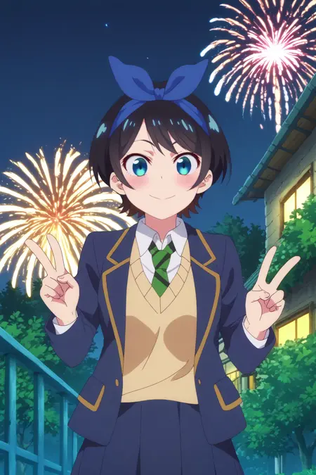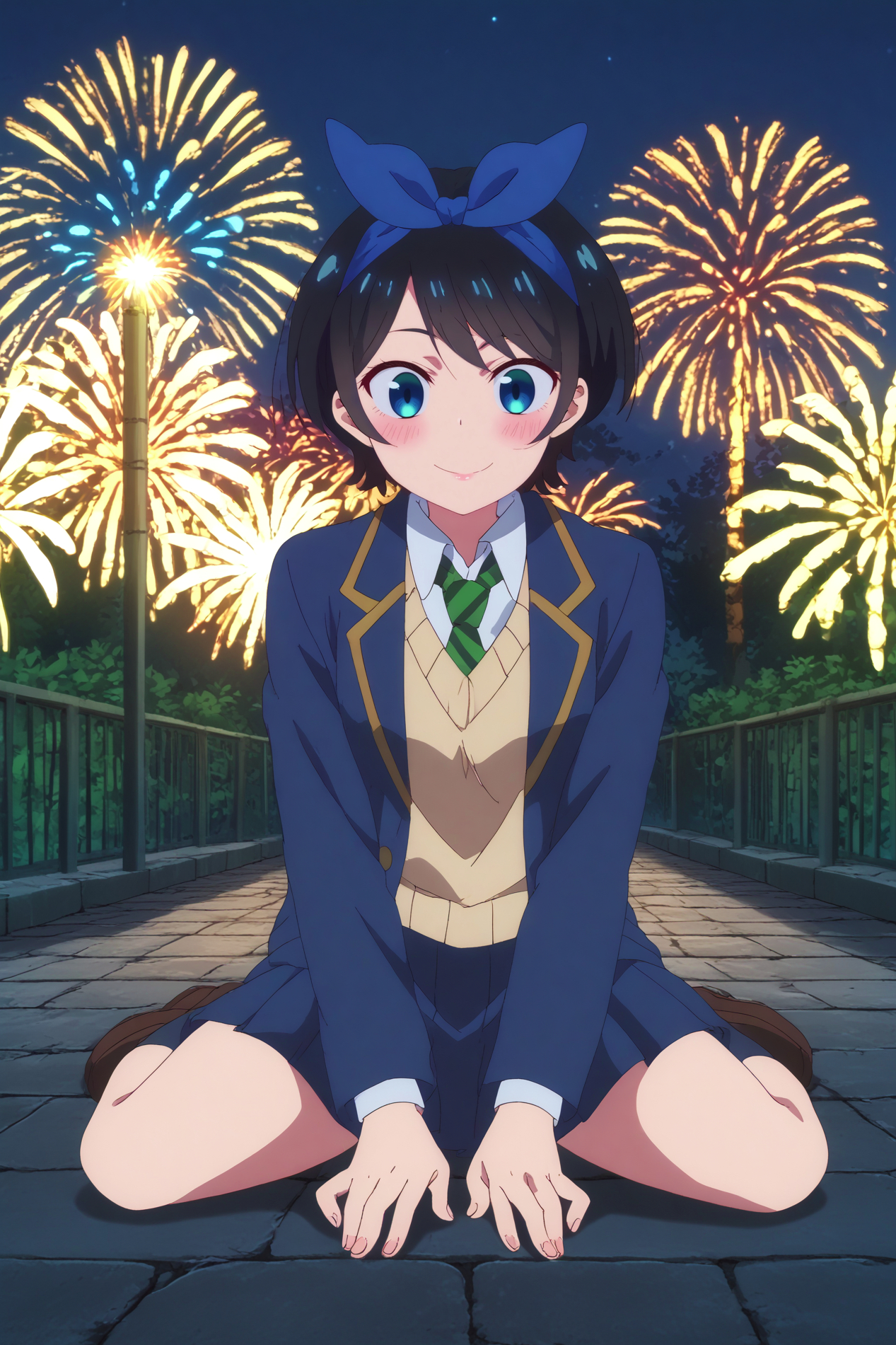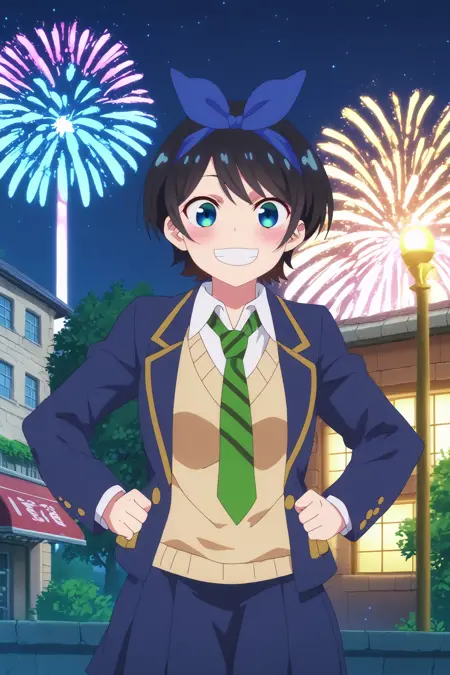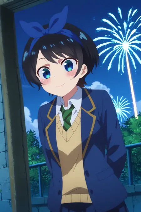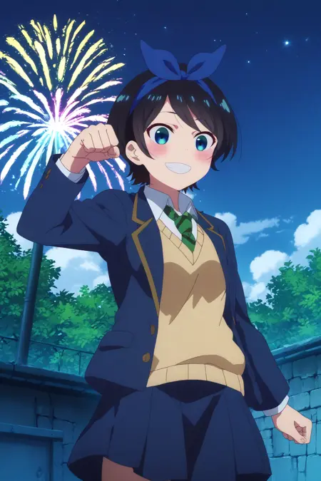🎆 - ruka sarashina,1girl,solo,smile,short hair,sweater,skirt,blush,blue hairband,bangs,hairband,school uniform,jacket,collared shirt,necktie,stripped necktie,shirt, long sleeves,blazer, sweater vest,black skirt
