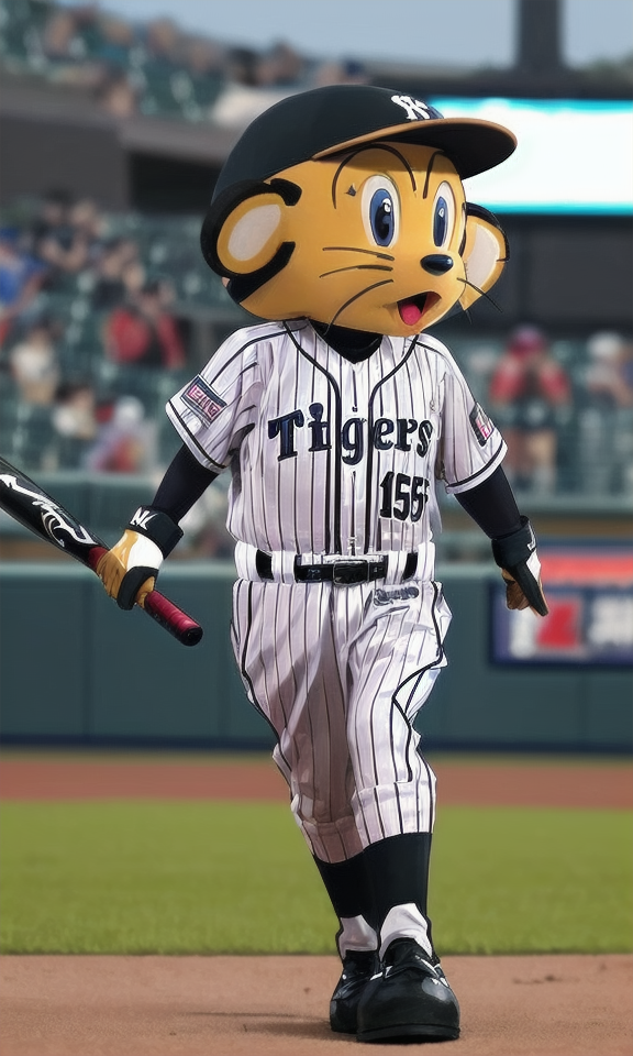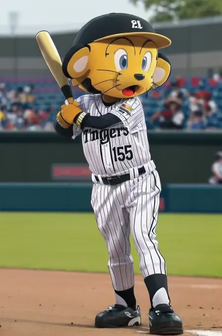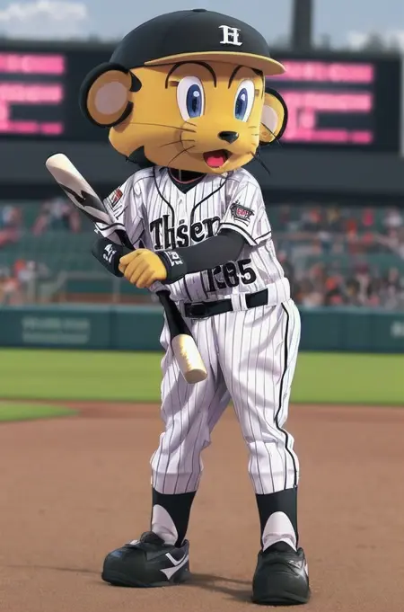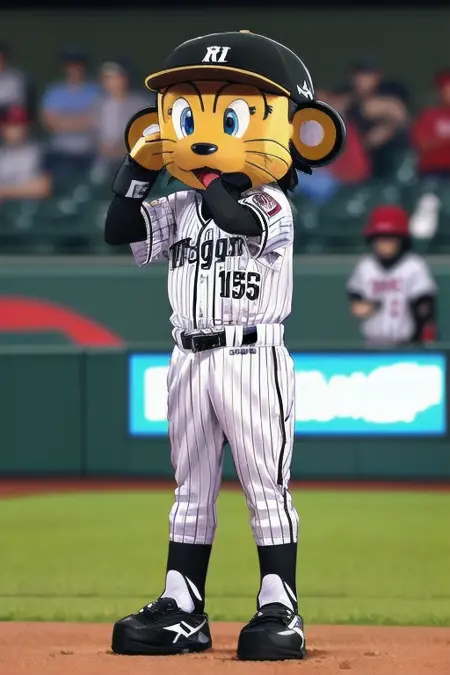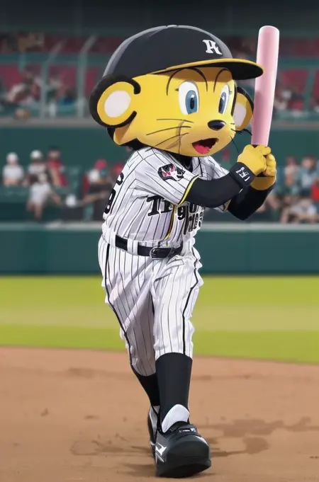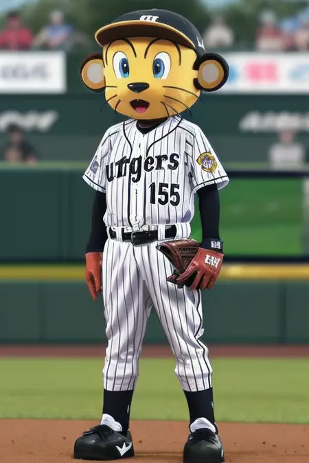 tolucky, mascot, sportswear, baseball uniform, gloves, helmet, baseball cap, striped, clothes writing, baseball, standing, belt,