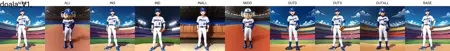 doalaV, baseball uniform, baseball bat, mascot, open mouth, smile, belt, holding, clothes writing, baseball cap, white pants,